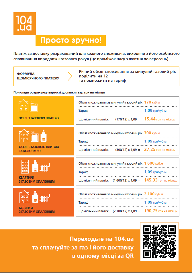 Щомісячний платіж за доставку газу розраховується так: сума кубів газу, спожитого за газовий рік, множиться на тариф на доставку. Результат ділиться на 12 рівних платежів, які сплачуються щомісячно впродовж року.